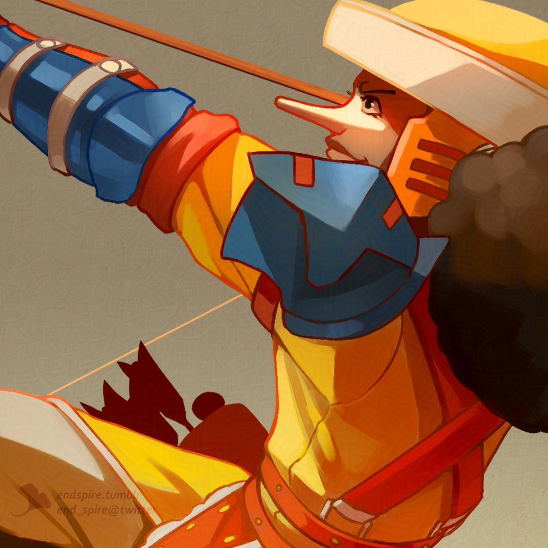 At first I considered a design that exposes half of his chest and an arm, to show off Usopp's physique like his post-timeskip outfit. But thinking about it, he would prefer armor to keep himself safe. Some of Usopp's original design elements translated over well! His headphones became these kind of ear-covers. His blue and white wristband became blue armor with white straps.Usopp naturally suits a class that's meant to be away from the frontlines. I like to think of him being able to do his best when he's hiding behind another character. Thinking about it, Usopp fits the villager archetype the best!